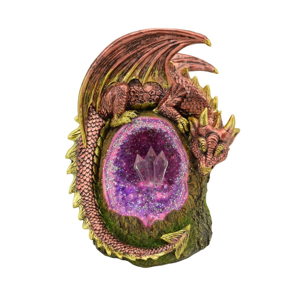Brighten up your shelves with this beautiful dragon backflow incense burner. This red dragon with its geode is split down the middle revealing the glistening crystals within.