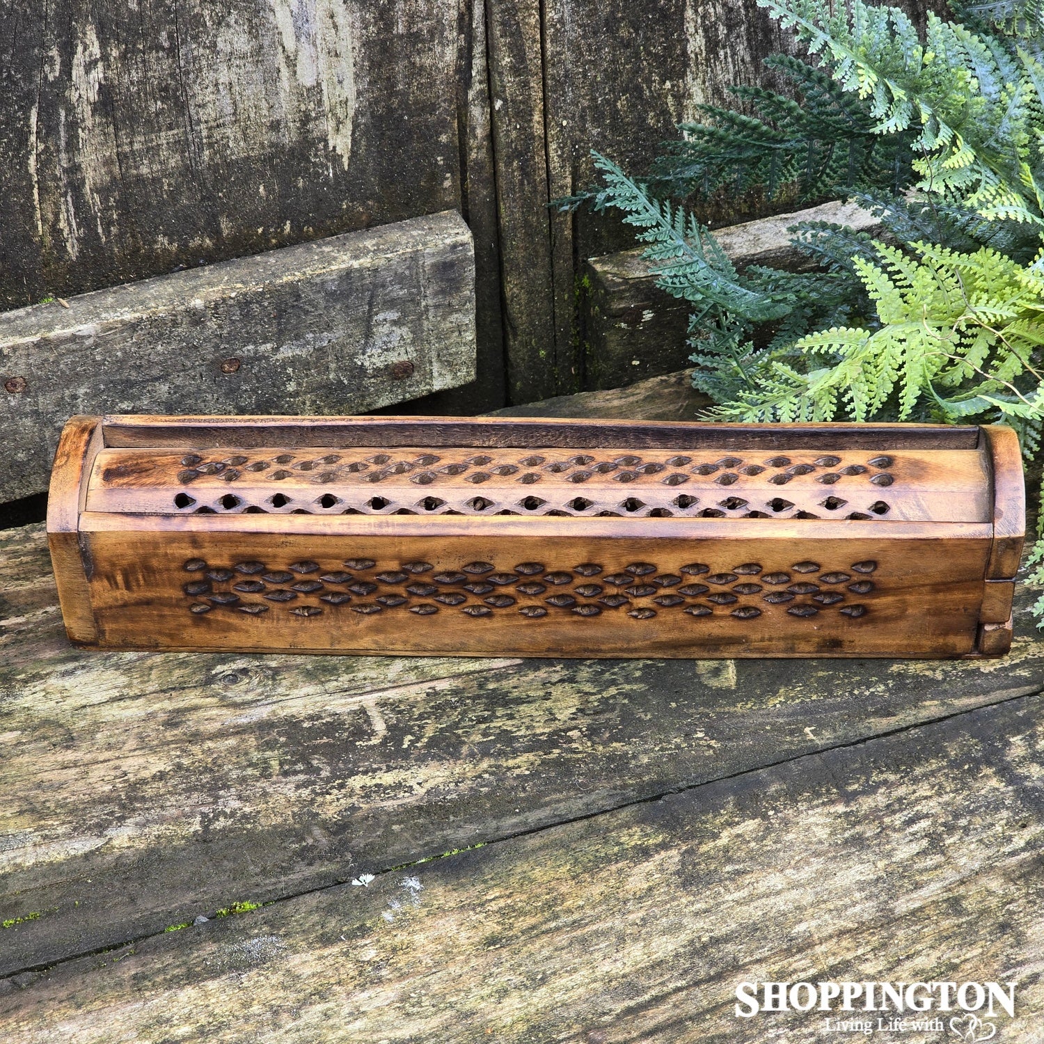 Made from mango wood with antique finish. Sliding top incense box has holes for incense and two cone burners with storage in the bottom. Hand crafted in India.