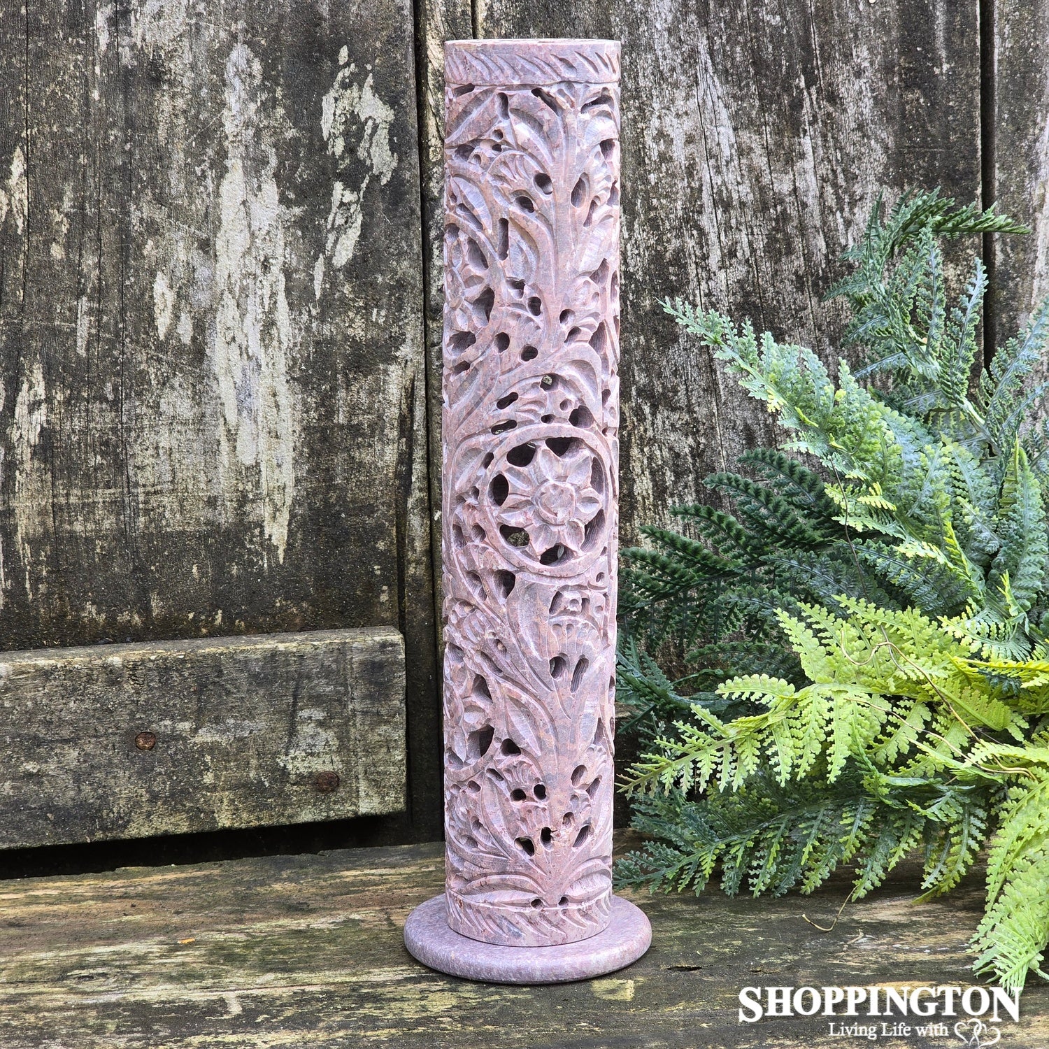 Place an incense stick or cone in this soapstone tower featuring a flower design. Handcrafted in India.