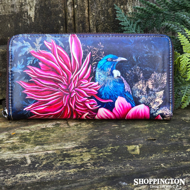 Leather NZ Print Long Wallet - Tui In Dahlia's - Anita Madhav