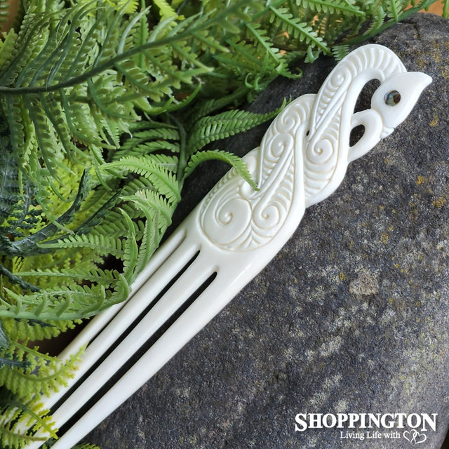 This beautiful heru is hand-carved from beef-bone. Many of these are finished in traditional Maori designs while others are more contemporary. Our bone carvers go the extra mile to create true stunning wearable art. These can only be made from the largest pieces of bone, so supply is limited. For M?ori, the huia feather was revered as a symbol of nobility, leadership, and hierarchy. The white-tipped tail feathers were worn as head adornments to signify chiefs and people of great mana (authority and power). Size approximately 195 L x 34 W (mm)