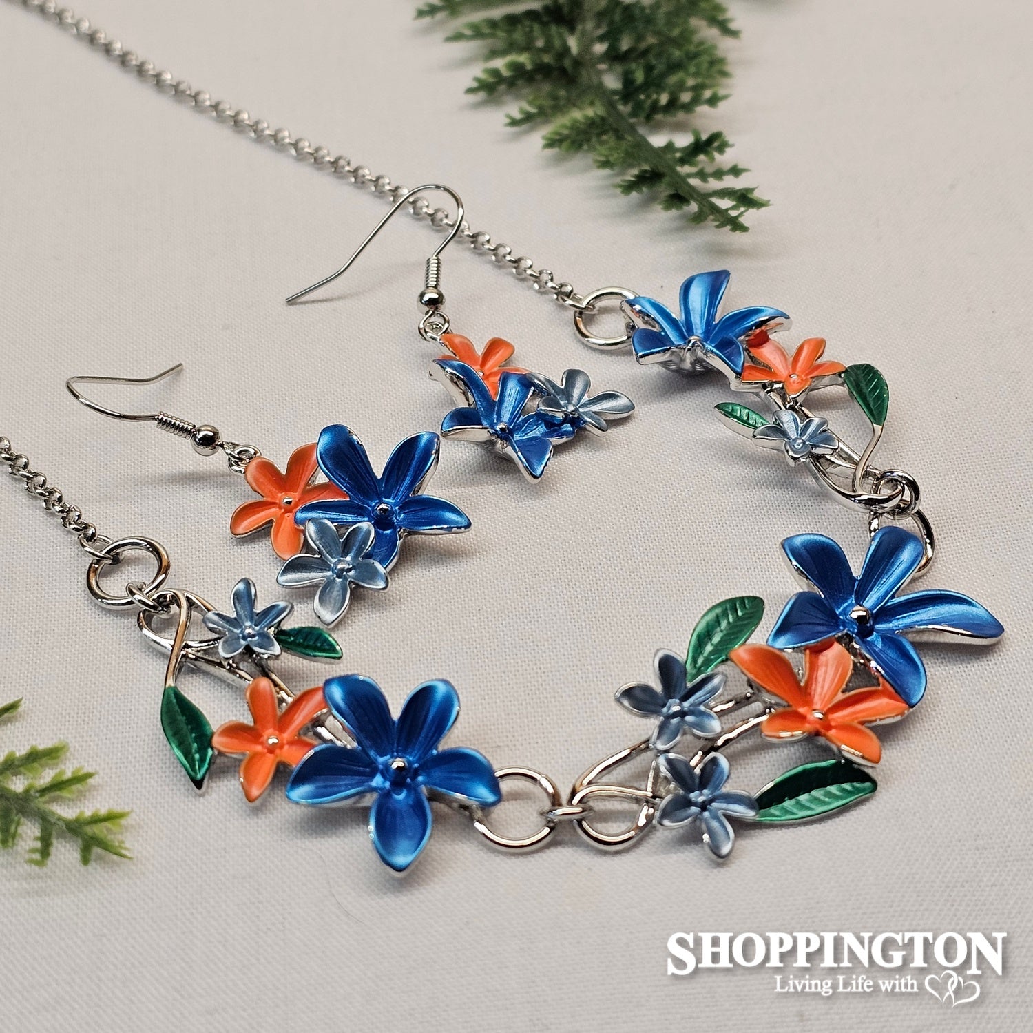 Necklace - Navy/Orange Flower Necklace & Earrings Set