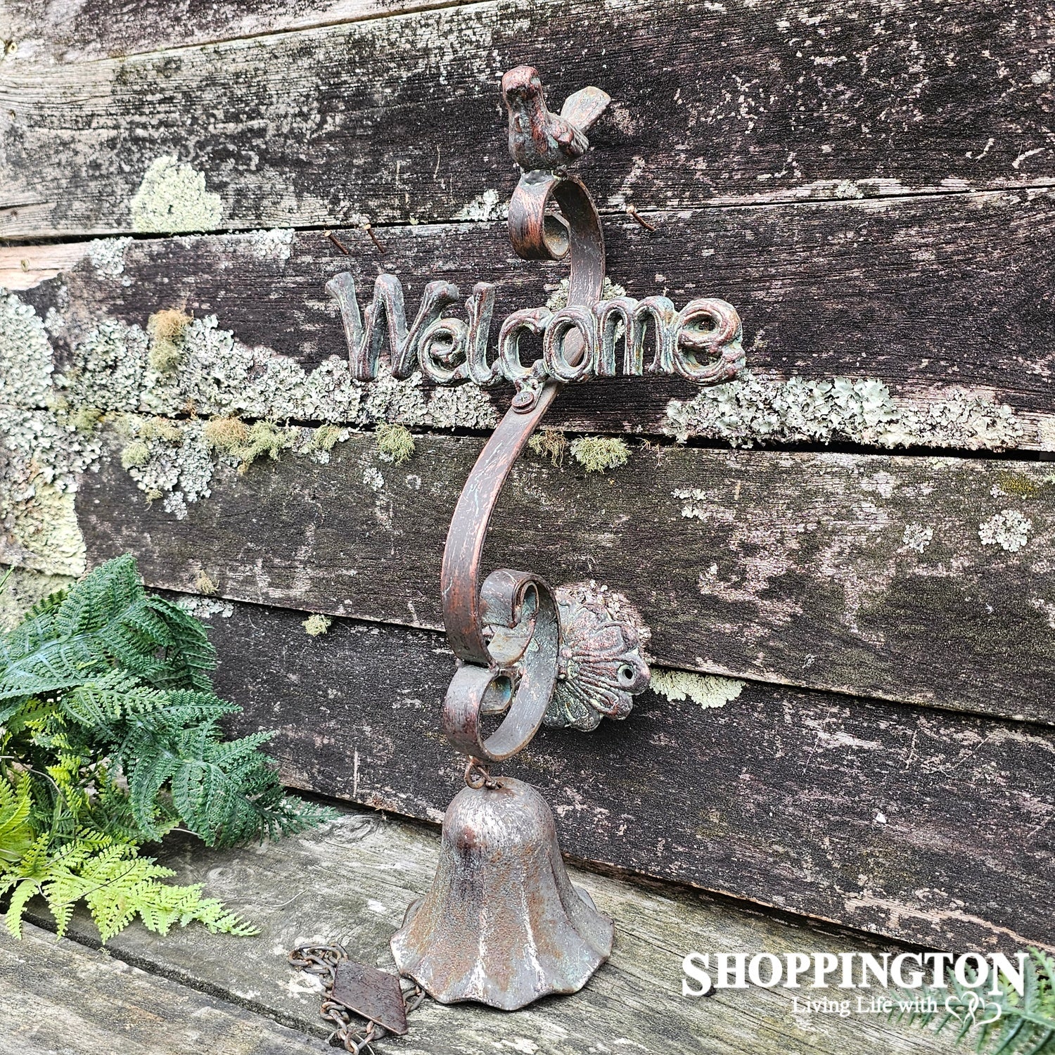 Hanging "Welcome" door bell featuring a bird and a rustic copper tone finish.