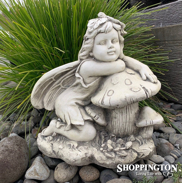 This statue of a fairy leaning on a toadstool is made from fibre resin and is both strong and lightweight.