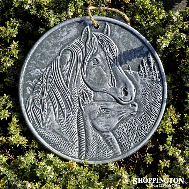 This terracotta sundial by Lisa Parker features a beautiful horse design that's brought to life with a rustic, silver finish. Perfect for garden enthusiasts and those who appreciate a blend of nature and utility, this plaque serves as an enchanting outdoor decor piece.