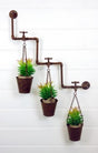 A distinctive iron wall mounted pot hanger. 3 chained buckets included. Greenery/plants not included. The faucet mount measures 52 x 10.8 x 52 cm without the hanging buckets.