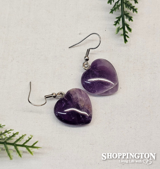 Beautiful heart shaped Amethyst drop earrings on surgical steel (hypoallergenic) hooks. The stones are 15mm wide and tall.