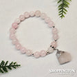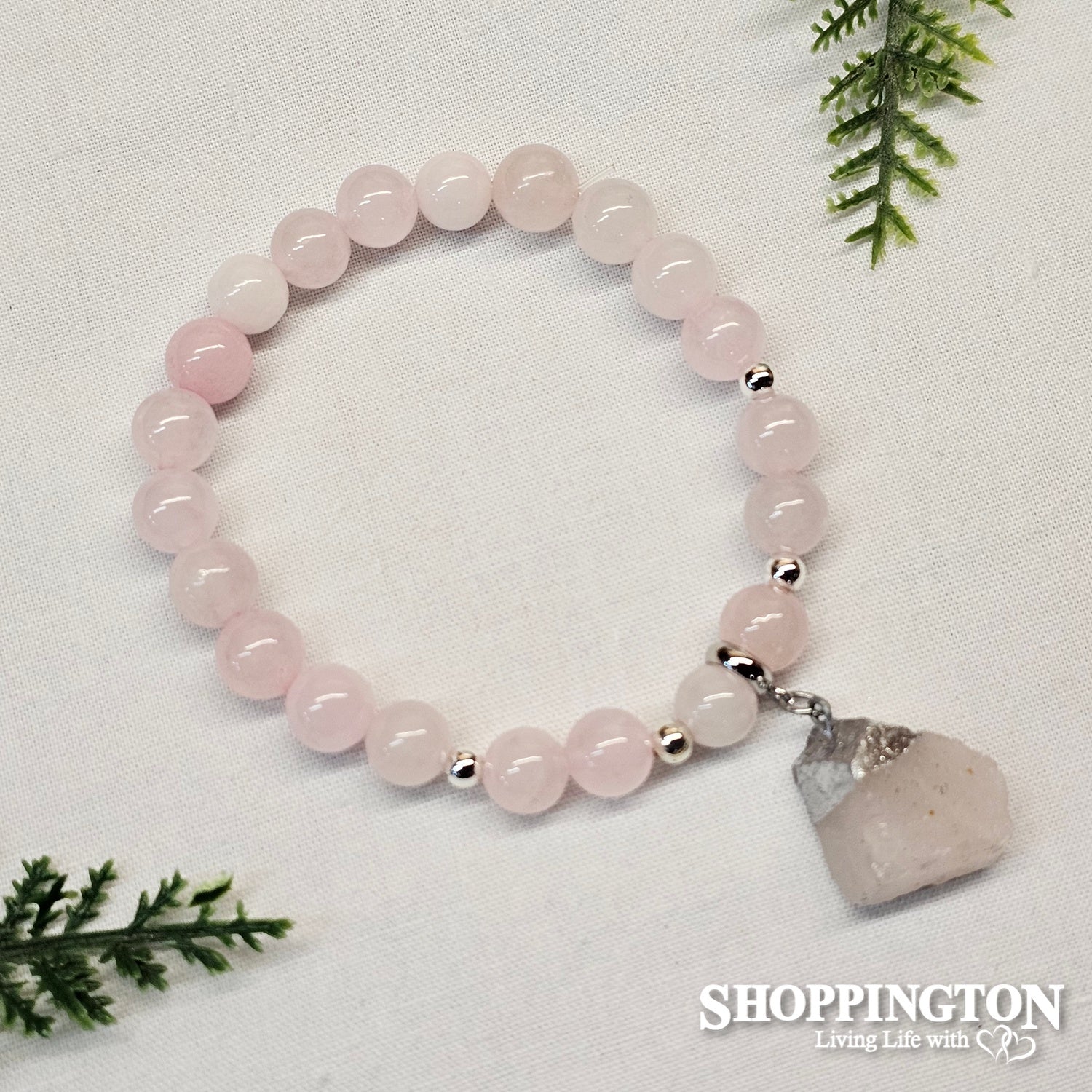 Rose quartz bead bracelet featuring a rough cut rose quartz charm.