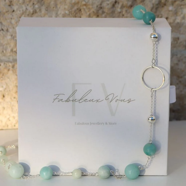 The amazonite stone is paired with the sterling silver curb chain, and a silver open circle feature, as well as intermittent sterling silver beads. Choose this necklace to wear everyday, and add an exciting pop of colour to any outfit.