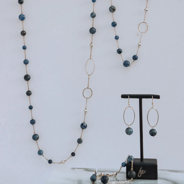The blue vein necklace features the beautiful tones of the semi-precious blue vein stone, also known as sodalite, in various sizes throughout the necklace. The blue vein stone is paired with the sterling silver curb chain, silver circle features, as well as intermittent sterling silver beads.