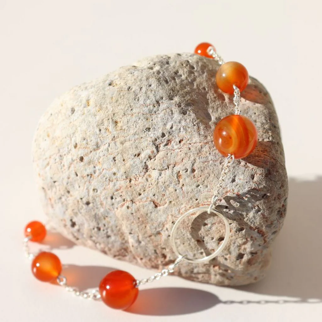 The carnelian bracelet is bright and quirky. The carnelian stone shows off the array of orange and yellow tones, while the chain is made from sterling silver. The chain includes sterling silver beads and an oval. The bracelet is 19.5cm and comes with a 3cm extender chain.
