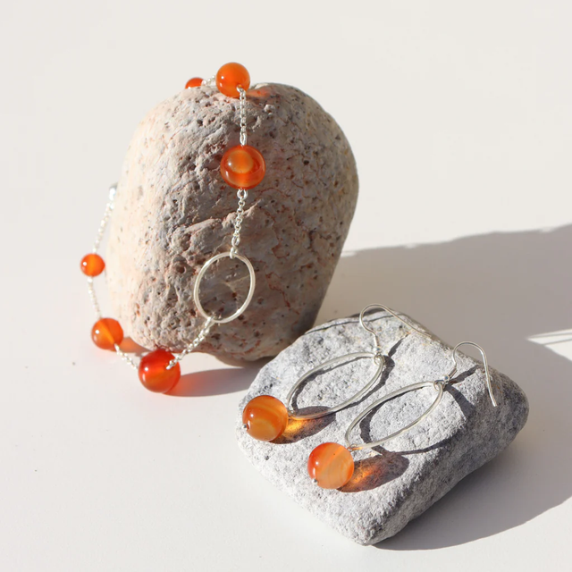 Hanging on a sterling silver hook style earring and sterling silver oval is the bright and vibrant carnelian stone. Every stone has its own colours and tones, making your pair of earrings perfectly unique.