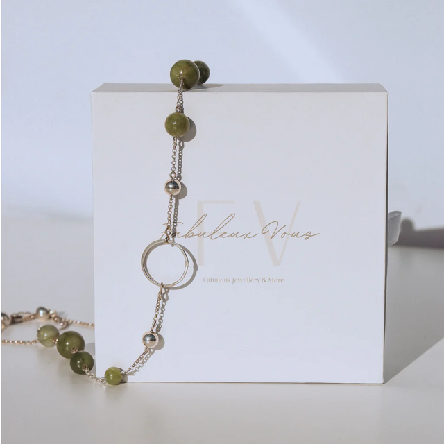 The green fuchsite short necklace features the beautiful, bright green tones of the fuchsite stone in various sizes throughout the necklace. The fuchsite stone is paired with the sterling silver curb chain, silver circle feature, as well as intermittent sterling silver beads. The total chain length is 50cm and comes with a 5cm extender chain.