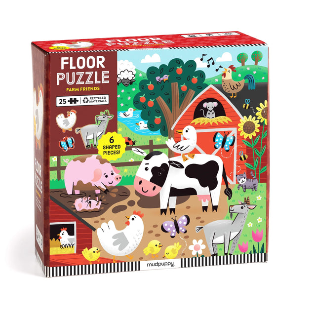 Mudpuppy's Farm Friends 25 Piece Floor Puzzle includes 6 special shaped pieces of colorful farm and barn animals. Oversized pieces are perfect for small hands and provide a fresh take on this classic puzzle format.