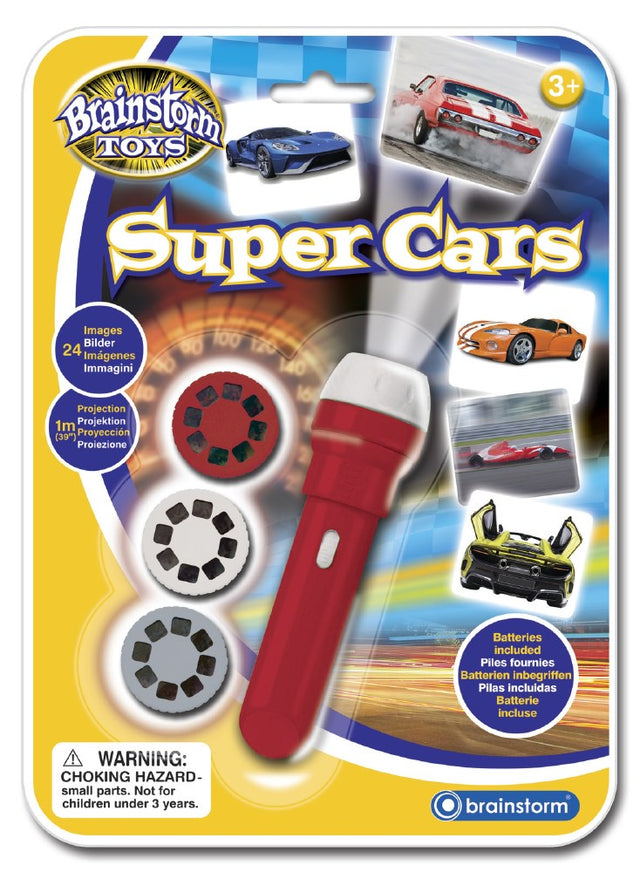 Transform your room into a Super Cars Race track with this fantastic projector torch. Simply shine the torch around your room and view the super cars. A great bedtime companion to make going to sleep more fun. The torch comes with three slide discs including 24 colour super cars photographs.