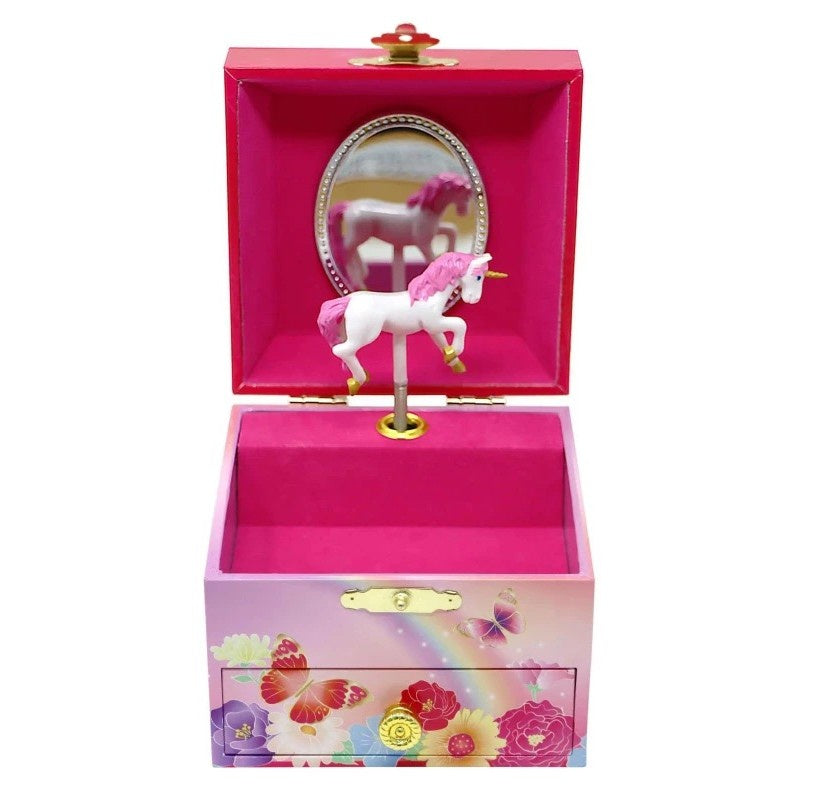 Pink Poppy’s Unicorn Butterfly Small Musical Jewellery Box is a gorgeous keepsake portraying fun illustrations of a fantasy land full of rainbows, butterflies, and flowers. It features an oval mirror and a flocked interior. The wind-up design plays the classic tune ‘Dance of The Sugar Plum Fairy’ whilst the Unicorn figurine twirls delightfully.