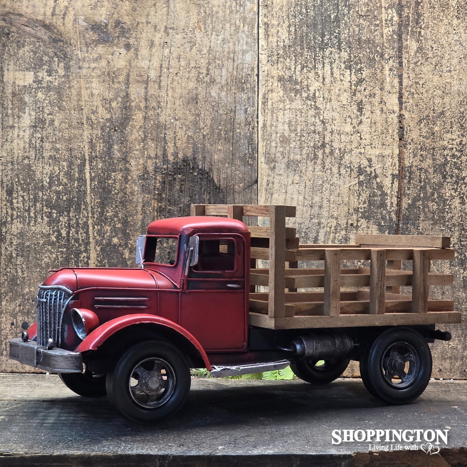 A handmade, hand-painted metal farm truck ornament with wooden tray. This ornament makes a great collector’s item or gift for a man cave, child's bedroom, rumpus room or office. No assembly required.
