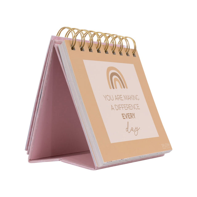 Hardcover self-standing flip book with 30 pages of affirmations and quotes.