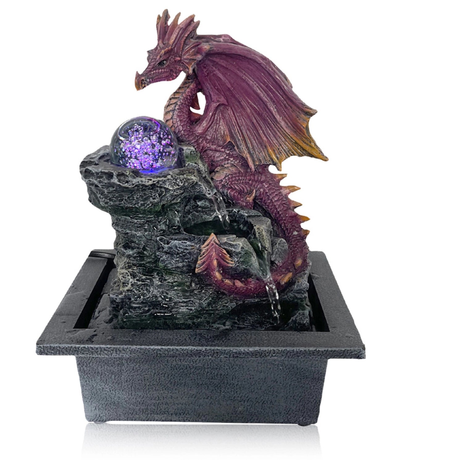 Unwind with the soothing glow of this tabletop fountain. The water provides a meditative atmosphere as it flows over a multi Coloured LED light under clear ball. The ombre blue dragons crouches protectively over the revolving ball indicating a sense of security and ownership