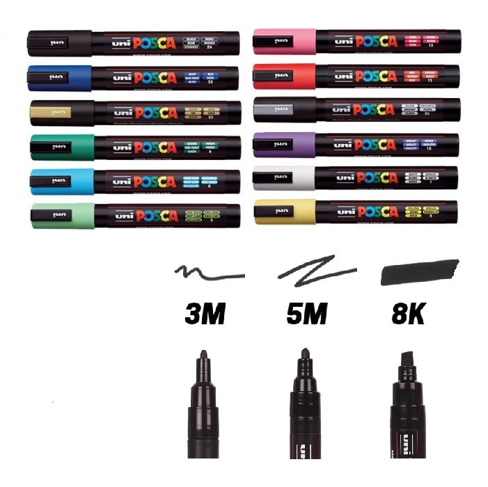 The PC-3M's versatile bullet tip offers unlimited freedom of use and adapts to all types of creation. POSCA markers are mixable and layerable, the water-soluble, non-toxic ink dries quickly and can be used on a variety of surfaces.