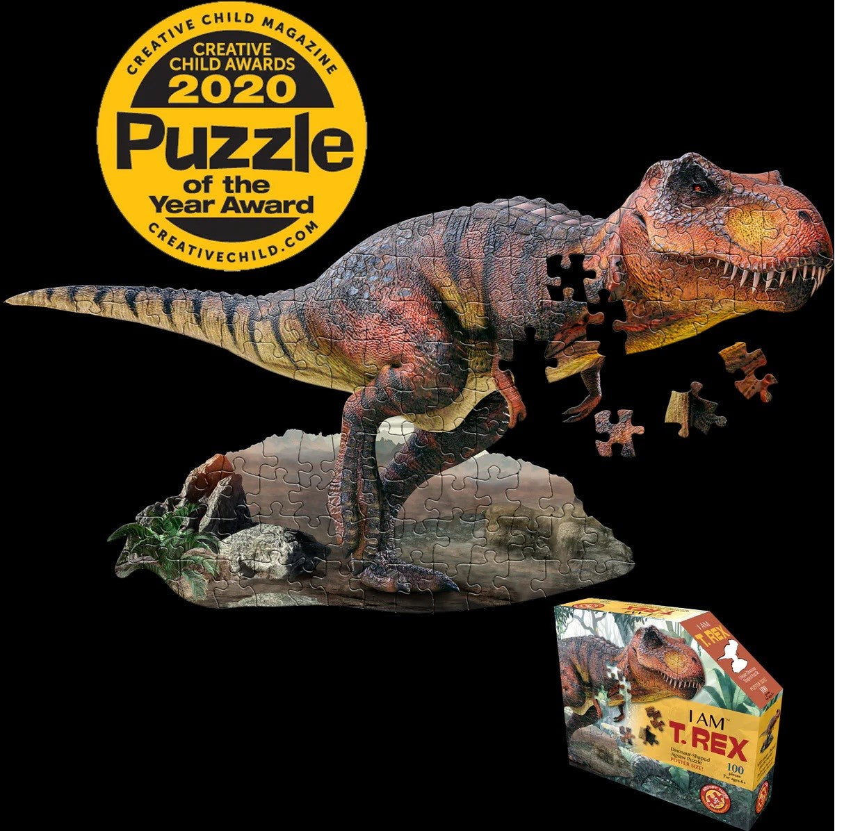 King of the World! Unique, dinosaur-shaped, 100-piece jigsaw puzzle for ages 6 and up. Poster-sized when completed. Puzzle pieces are oversized for easy handling.