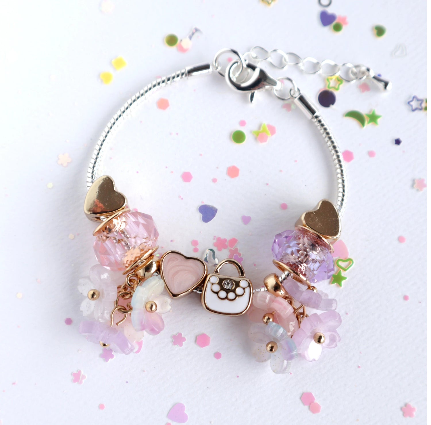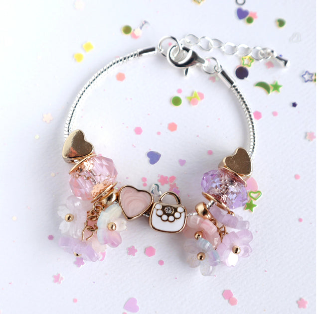 The Pretty Posy Charm Bracelet is a soft pink and purple ombre, blending the two colours along the line of charms from lavenders to pale pinks. Each flower is shaded a little differently, giving the bracelet plenty of interest. It also includes a large, sparkling diamante filled star and a beautiful white pendant covered in lavender flowers.