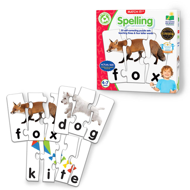 This colorful set of (10) three-letter and (10) four-letter puzzle cards provides children with an introduction to spelling. They can learn to spell by associating the object with the word and correctly assembling the puzzle pieces. The puzzles are self-correcting — only cards with the correct sequence will fit together. Match It! Spelling is a fun and easy way to learn this essential skill. Recommended for ages 4+ years.