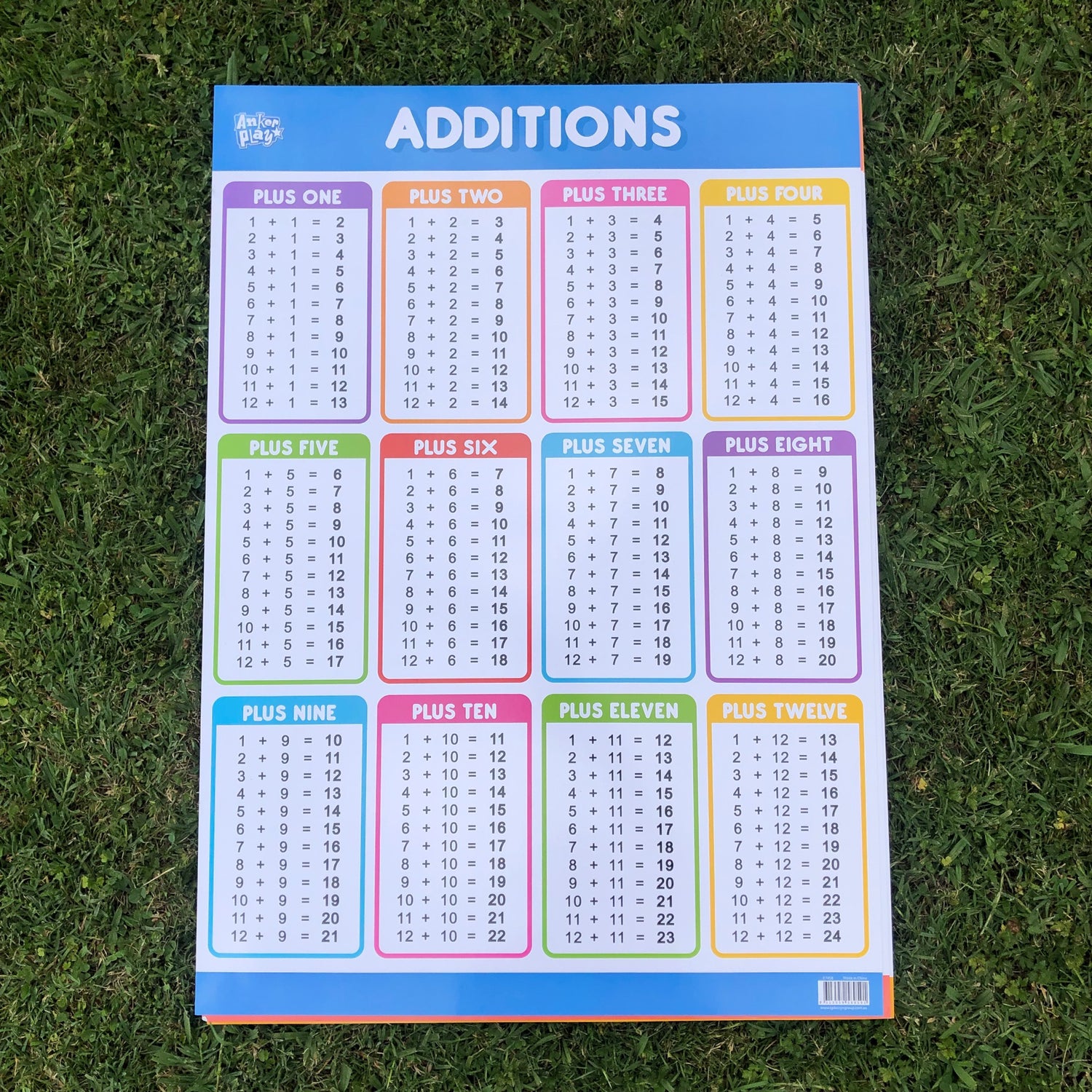 The Educational Addions Poster shows additions for numbers 1 to 12 in a colourful way with different cute objects assign to each number.