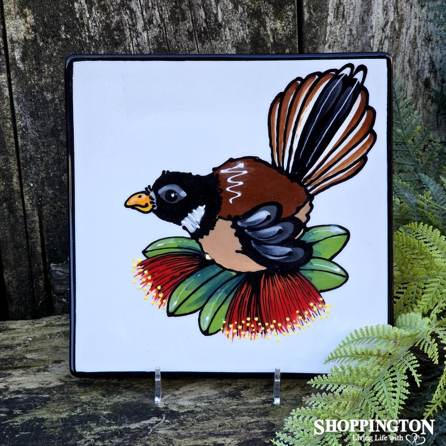 NZ Made Handpainted Square Plate / 20cm x 20cm / Double Pohutukawa Fantail