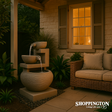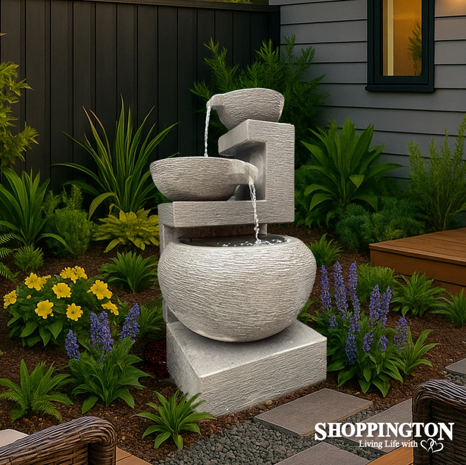 This water feature features geometric shapes of varying heights. Water ejects from each layer in a steady stream. The circular forms are set off by the strong lines of the supporting lineal arms which provide a sharp contrast in form and shape. Plenty of pouring sound in this model for those wanting to bring the sound of running water into their environment.