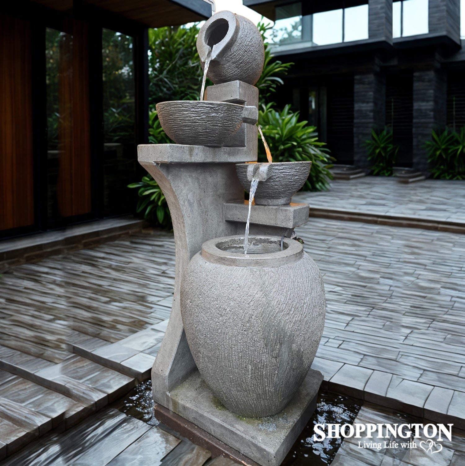 This water feature features a stunning 4 tier design. This piece provides a plethora of shapes and directions to entertain the eye as the water spills from the top pot into two basins and finally falls into the large receptacle at the bottom. The curved features if the receptacles are offset by the linear framework that supports them – providing both horizontal and vertical interest. Lots of water sounds and light capturing falls. This piece requires a surprisingly small space of 50 cm square. Total height is 140 cm. Total weight is 380 kg or 1.4 c but this breaks down into 8 pieces for transportation and installation. It required the addition of a 1500lph pump to complete the package .