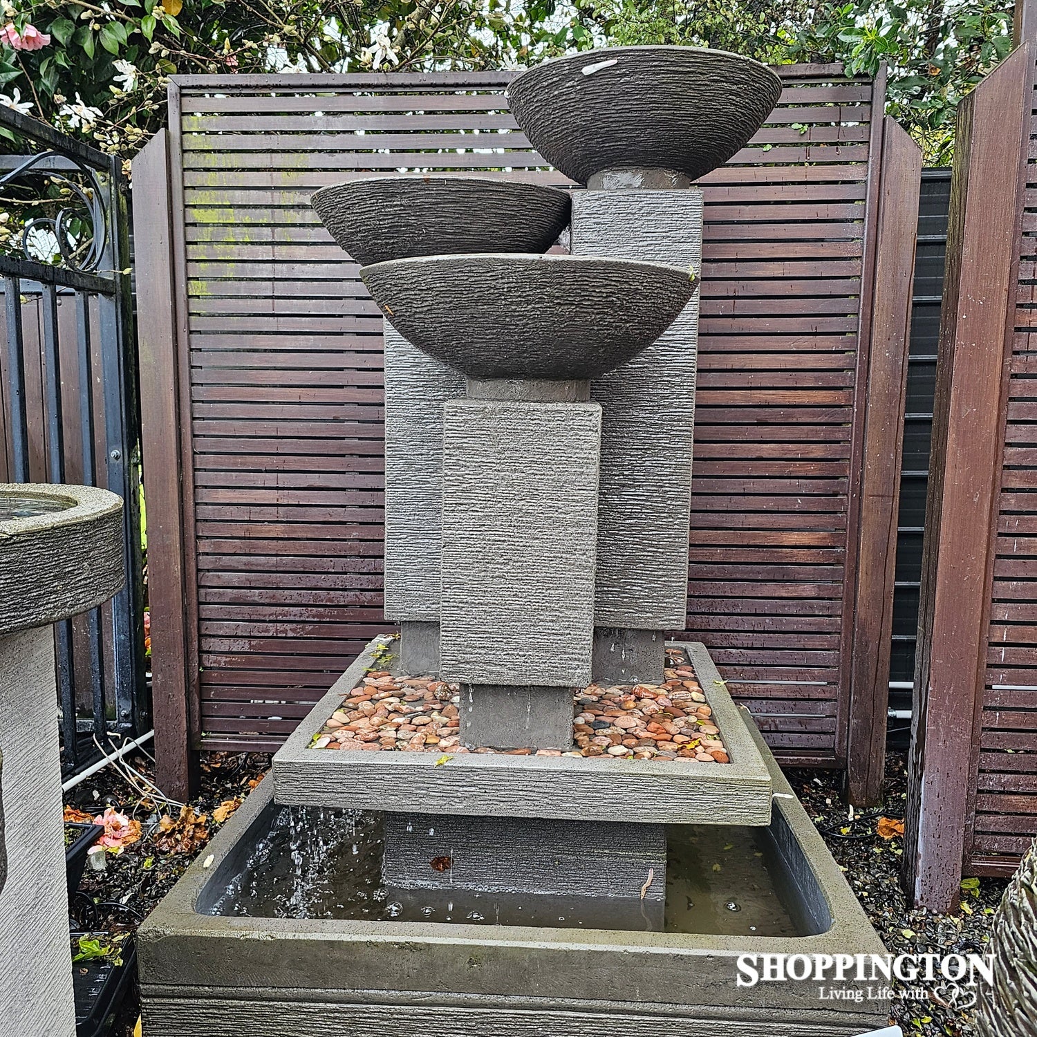 This water feature features stunning 3 bowls that cascade down into a circular base, repeating the circular forms. These forms are contrasted with the vertical lines of the pillars that support the bowls. These vertical lines are softened and replicated by the play of light on the water as it falls to the base trough.