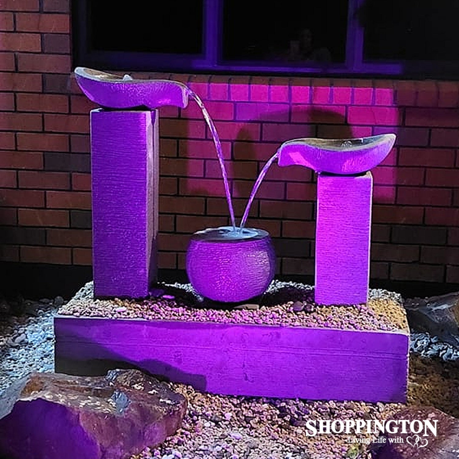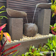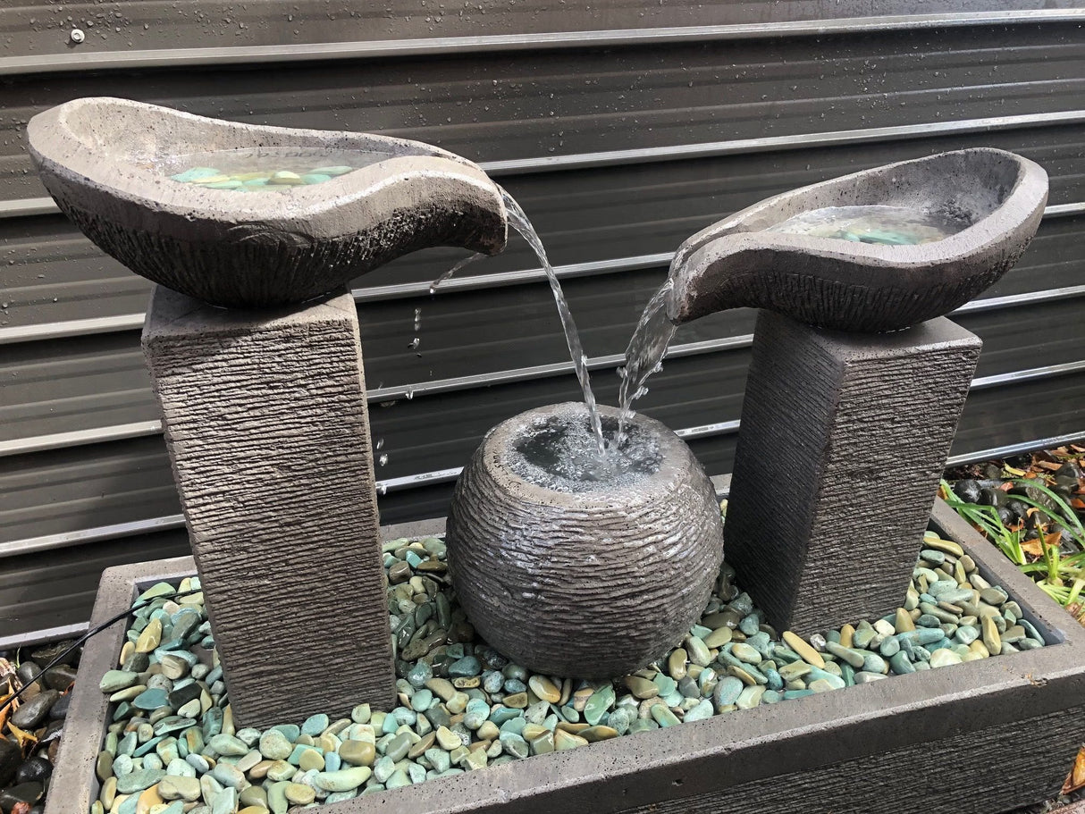 A visual delight to the eye is created by two variable concrete towers supporting oval jugs. Water pours from these into the ball like contasiner that rests between them. This in turn overflows into the elongated trough. The towers and ball are supported by a plate that can have additional decorative pebbles added. Plenty of water noise from the fall of the water. This water feature features is a fabulous way to incorporate water and art into the garden.