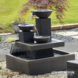 This water feature features a stunning 4 tier design . A 90 cm square base houses an internal rising plate that elevates the structural parts of the water feature above the base top. Two textured concrete towers of differing heights further raise the pouring vessels so that water falls from the highest of these vessels to the second vessel and from there into a circular bowl. Once the bowl fills the water then overflows onto the rising plate before cascading back into the base proper. The varying structural shapes and direction of water flow create a pleasing visual contrast. This also increases the light relection from the water as it flows out of and over the different surfaces. Plenty of water "noise" with this unit. If desired the top of the rising plate can have added decorative stones as yet another visual texture.