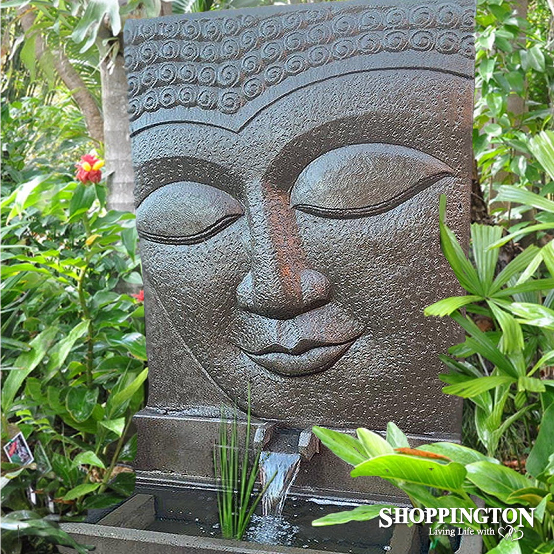 This water feature features a smiling buddha face, intricately modelled as a walll focus. Water flows over the top of the wall to glisten off the moulded facial features and drop via a directed funnel below Buddha's lips. Sure to bring good fortune and a peaceful miasma to any outdoor setting, this is a fabulous way to incorporate water and art into the garden.