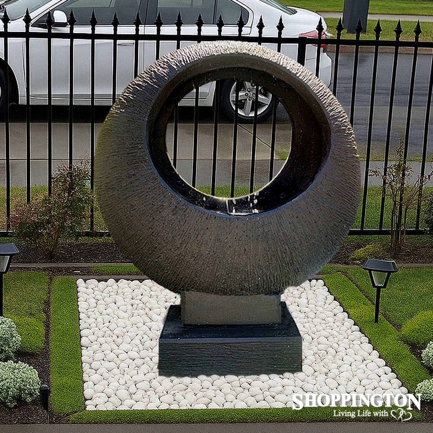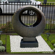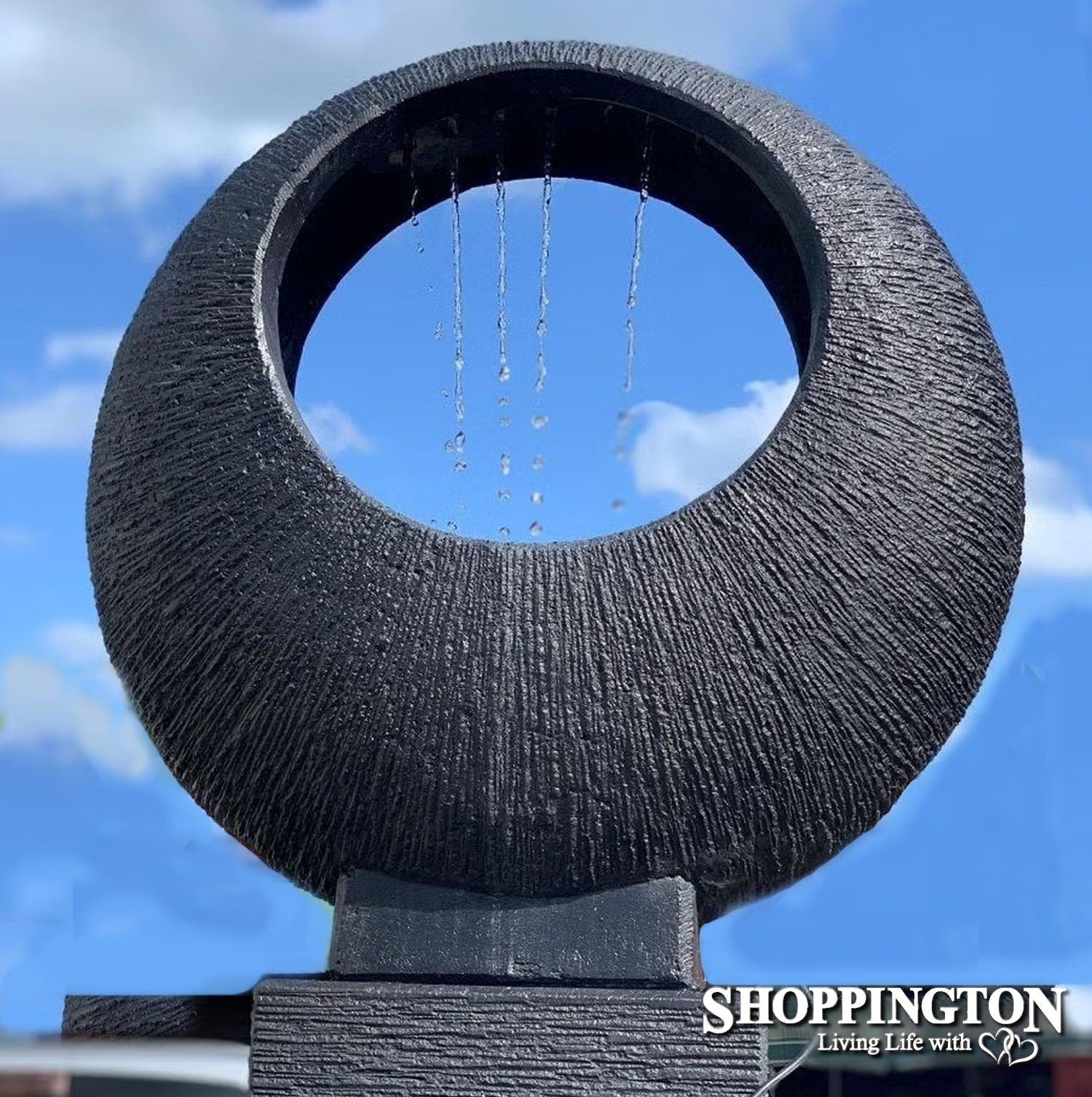 This is the smaller of our open circle designs that cascade water through nozzles at the inner top of the sphere to create a uniform curtain of water falling to the base receptacle. It come complete with its own stand for easy installation. A fabulous way to incorporate water and art into the garden.