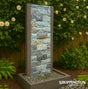 This water feature presents a solid block stone wall in cool mountain tones. Watercascading down the face from the top the water noise is softly nurturing. The soft colours of the stone reflect light off the water further enhancing the visual. The green rocks are bordered with textured concrete uprights. The water accumulates under the base plate which can have additional decorative pebbles in complementary or contrasting tones added. A fabulous way to incorporate water and art into the garden.