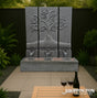 Three tall handcarved pillars are surrounded by textured concrete frames. As the water flows gently over the slate the colours come alive insubtle shades of natural greys and shadows. The base trough is large enough to provide a gap between the panels to avoid a solid wall. Creepers could add to the ambience in behind the feature. The addition of lights further enhances the colour changes in the pillars and the effect of the water glistening downwards.
