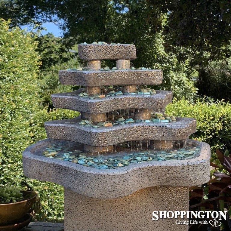 This is a delightfully gentle water feature that cascades water down four layers of textured concrete platters. The platters can be visually enhanced by the addition of decorative pebbles. The light shimmers off the water as it falls from one level to next. A very contemplative and relaxing unit