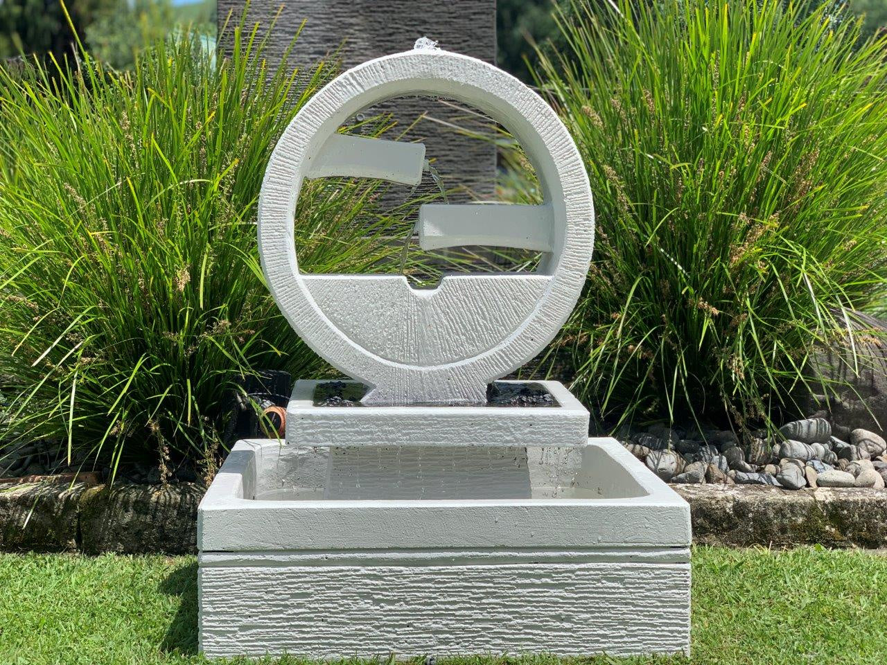 A smaller version of our River of Life water feature, this model has a circular construct with two horizontal arms in the centre of the circle. These are offset so the water flows from one to the other before dropping to the plate that supports the circle. This plate can be enhanced with decorative pebbles if desired. Water flows over the plate and drops into the textured base tank. The contrast of the circle and the horizontal arms provides lots of visual interest. This water feature features a stunning cascading effect, a fabulous way to incorporate water and art into the garden. This model has been painted with a special light coloured concrete paint to contrast against dark backgrounds