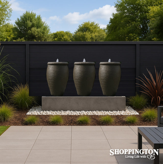 This water feature features 3 bowls, a fabulous way to incorporate water and art into the garden. Our water features are 100% handmade from solid concrete (with steel reinforcing). Fully self-contained and made to last.