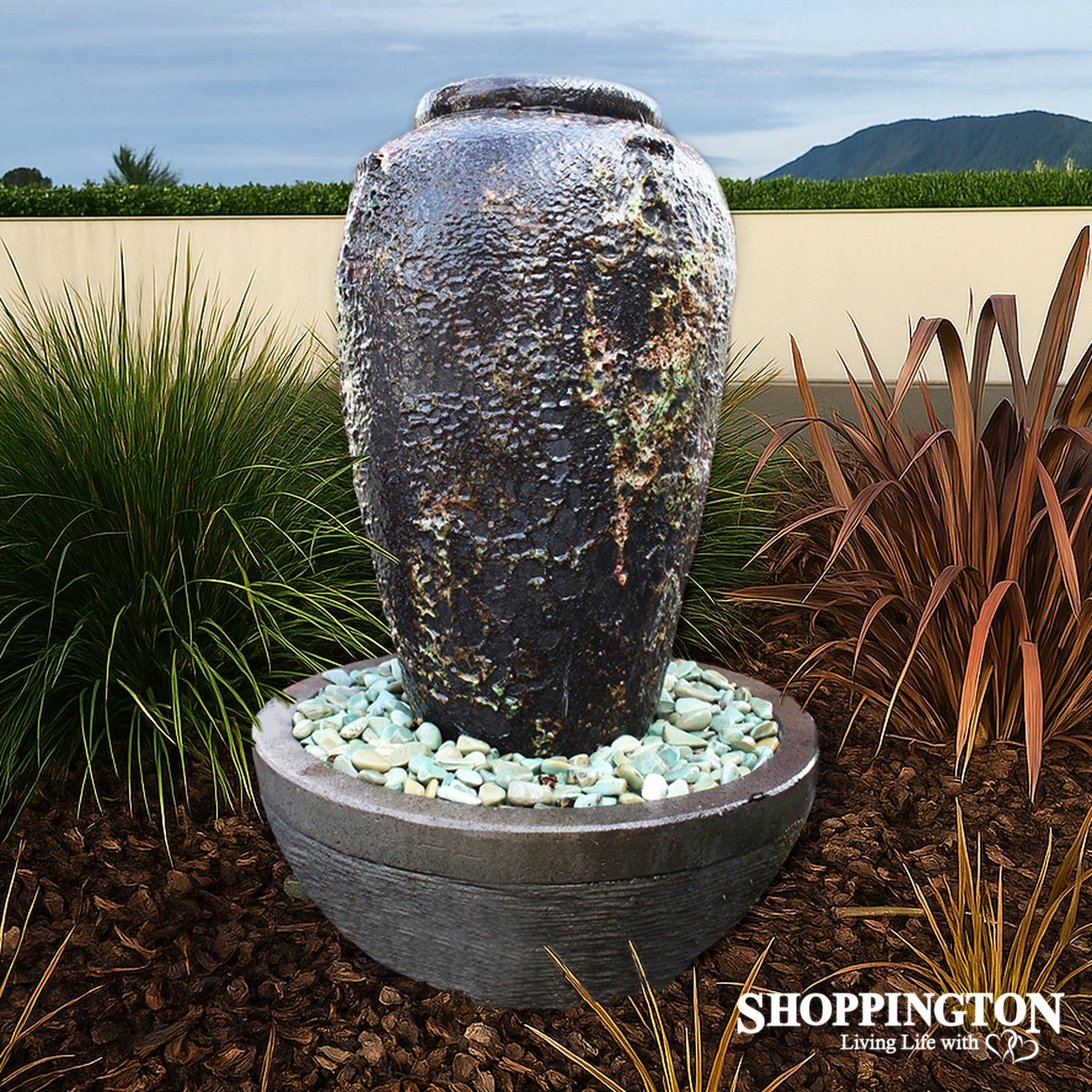 This water feature features a stunning concrete urn with cylindrical detail, a fabulous way to incorporate water and art into the garden. Our water features are 100% handmade from solid concrete (with steel reinforcing). Fully self contained and made to last.