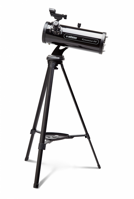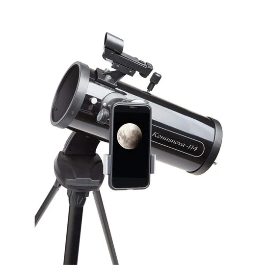 The Konus KonusNova-114 f/3.8 AZ Reflector Telescope makes an ideal entry-level instrument, with a large-aperture primary mirror that is well-suited for making detailed observations of the moon and planets; and bright deep-sky objects like star clusters, binary systems, and nebulae. Supporting the optical tube is a basic manual alt-azimuth mount and an adjustable-height aluminum tripod. This observation kit comes complete with two eyepieces that provide low 25x and moderate 62.5x magnifications with a moon filter, a universal smartphone adapter, 2x Barlow lens, and an unmagnified red-dot finder to make locating objects easier and star-hopping navigation faster.