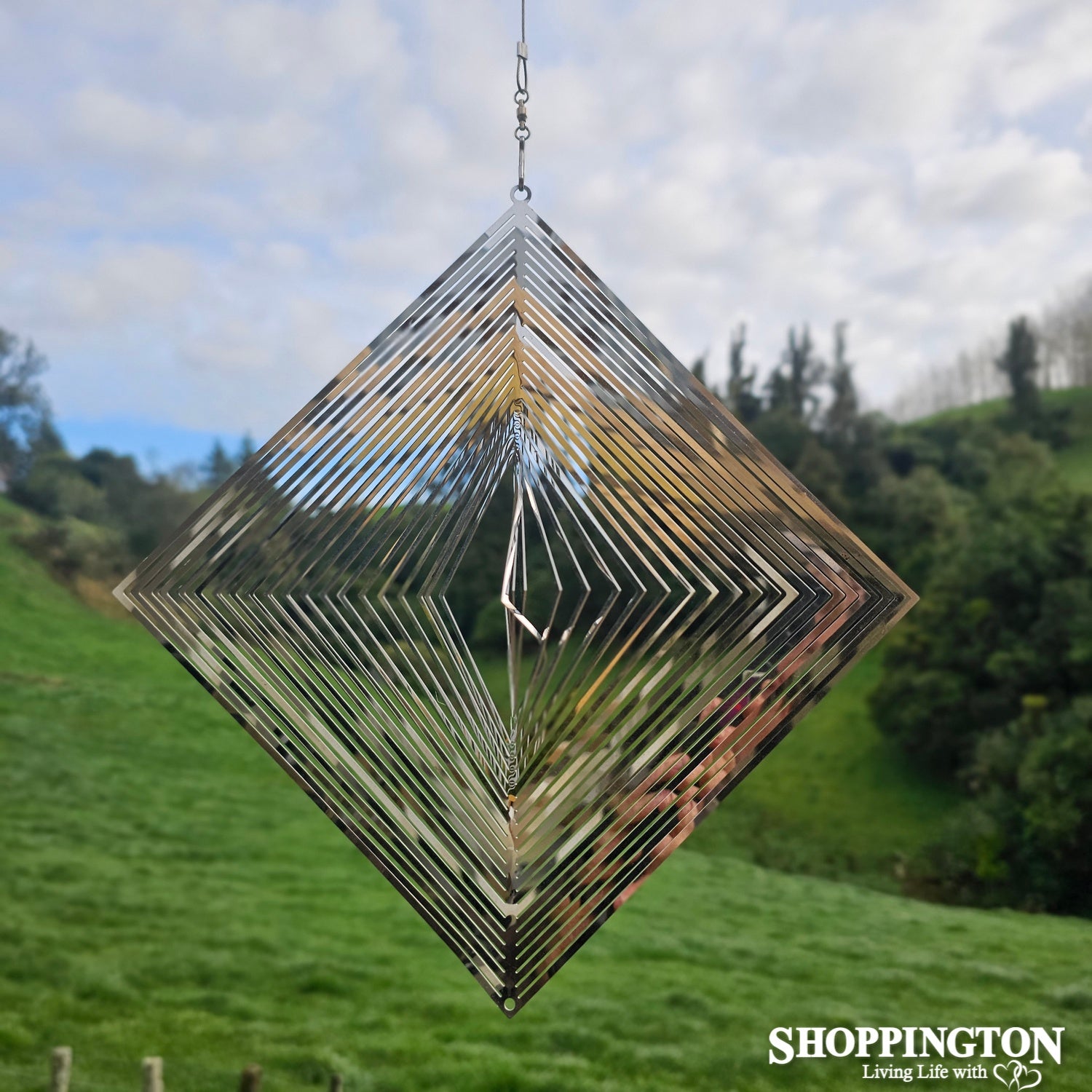 This classic diamond shape creates such a statement when it spins! Gorgeous repeating patterns relax and inspire while the design is sure to suit any style of garden. Spins in a gentle breeze or a strong gust, creating beautiful patterns and reflections of light. Complete with a flawless mirror finish.