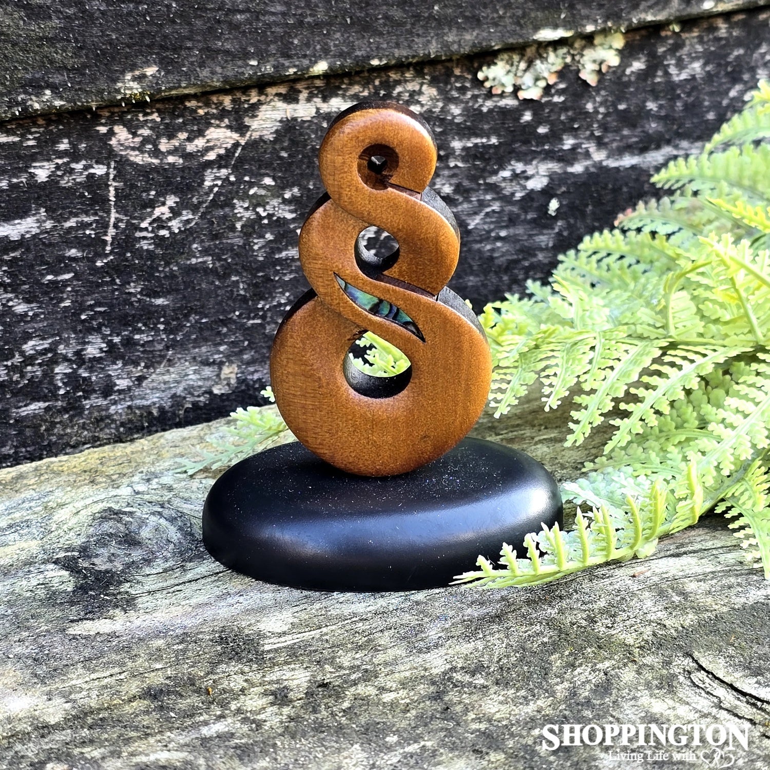 This freestanding twist is carved from one of our most beautiful New Zealand timbers, Kauri. Crafted from ancient swamp kauri, the timber is estimated to be more than 40,000 years old! The never-ending loop, or twist (Pikorua), represents the nature of eternal love or friendship, and the bonding of that relationship for life. This lovely twist is embelleshed with paua and sits on a black oval base. It stands approx 6.5cm high. Proudly made in New Zealand.
