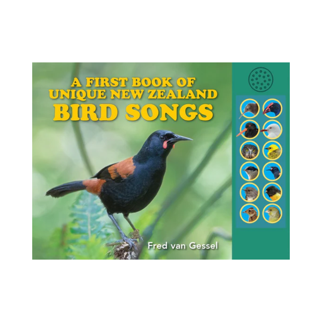 This beautifully illustrated sound guide is the perfect way to introduce both children and adults to the wonders of bird song. Each of the 12 species covered – Morepork, kaka, Sacred Kingfisher, Grey Warbler, Silvereye, Bellbird, Tui, Fantail, Chaffinch, Song Thrush, Blackbird and Starling – has a short description explaining some fascinating facts about the bird. The reader can then press the relevant button on the side panel and a 10 second burst of the bird’s song will be played via the accompanying speaker.